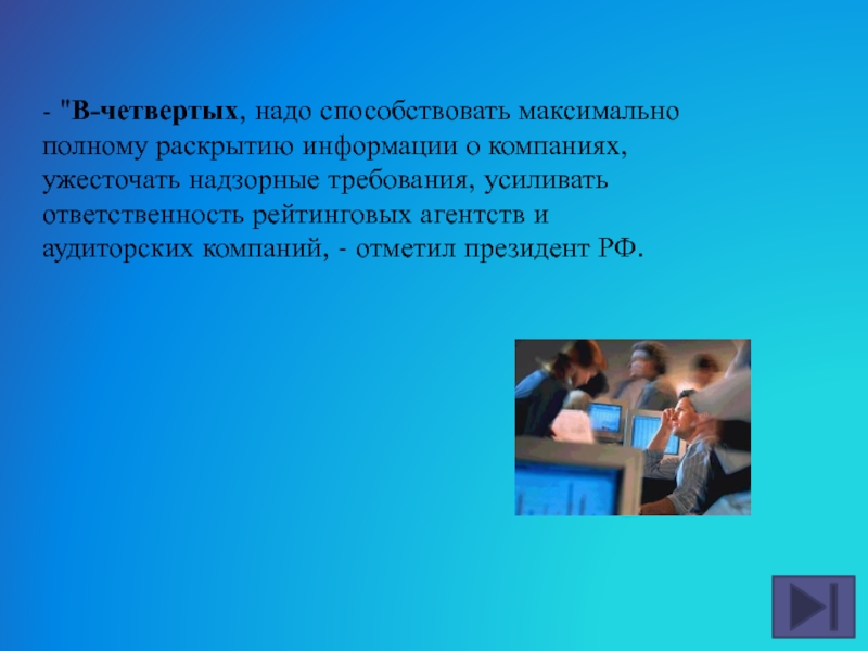 Слайд 33- "В-четвертых, надо способствовать максимально полному раскрытию информации о компаниях,