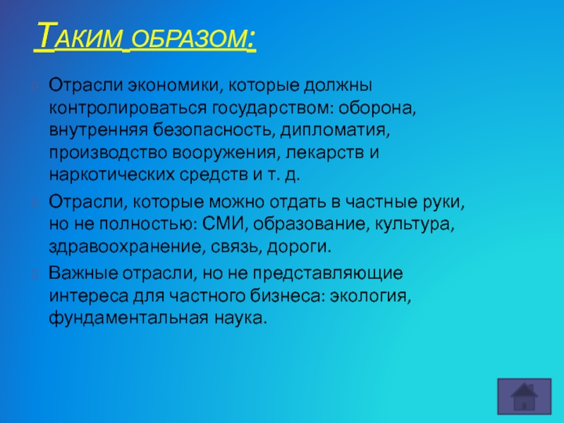 Отрасли экономики, которые должны контролироваться государством: оборона, внутренняя безопасность,