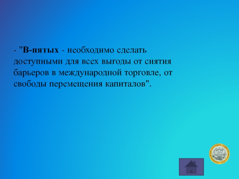 Слайд 34- "В-пятых - необходимо сделать доступными для всех выгоды от снятия