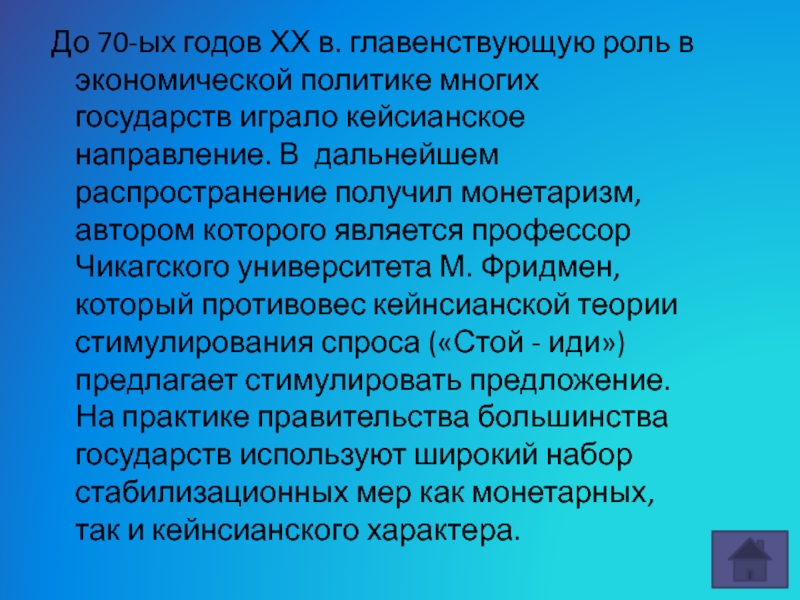 автором которого является профессор Чикагского университета М. Фридмен, который противовес кейнсианской теории стимулирования спроса («Стой - иди») предлагает стимулировать предложение. На практике правительства большинства государств используют широкий набор стабилизационных мер как монетарных, так и кейнсианского характера.
