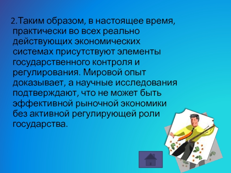 Мировой опыт доказывает, а научные исследования подтверждают, что не может быть эффективной рыночной экономики без активной регулирующей роли государства.
