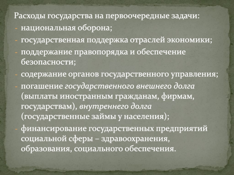 финансирование государственных предприятий социальной сферы – здравоохранения, образования, социального обеспечения.