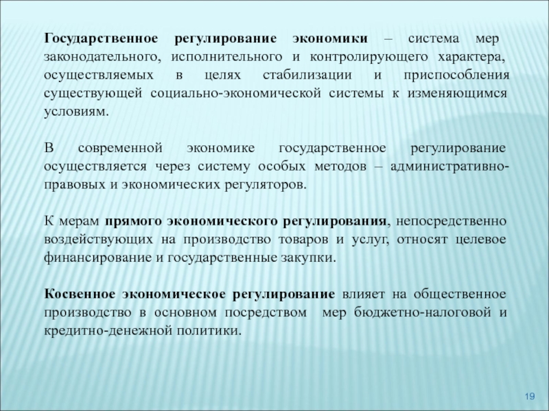 Слайд 19Государственное регулирование экономики – система мер законодательного, исполнительного и контролирующего