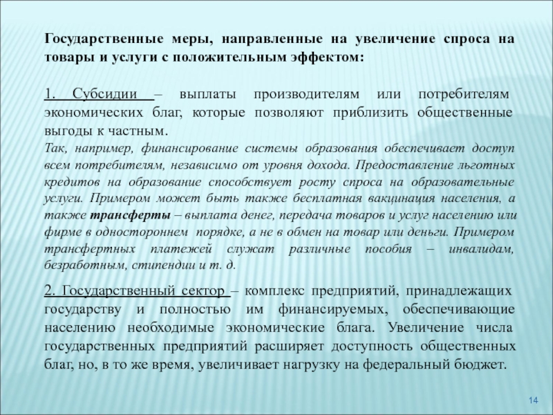 Слайд 14Государственные меры, направленные на увеличение спроса на товары и услуги