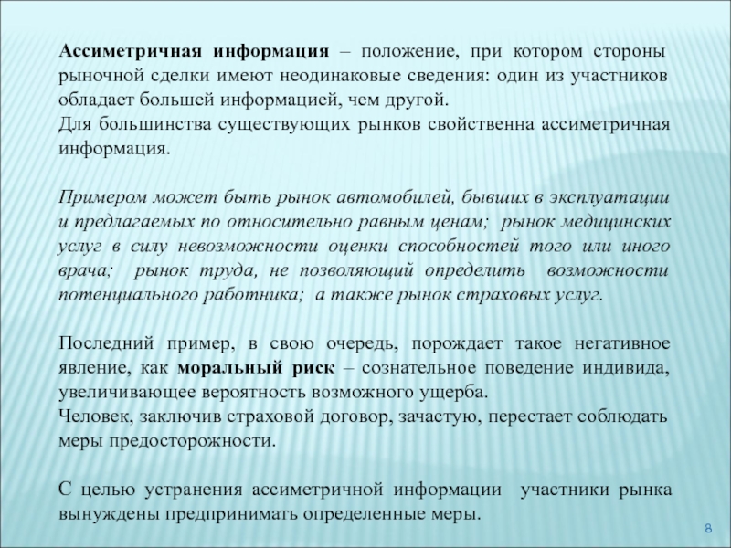 Слайд 8Ассиметричная информация – положение, при котором стороны рыночной сделки имеют
