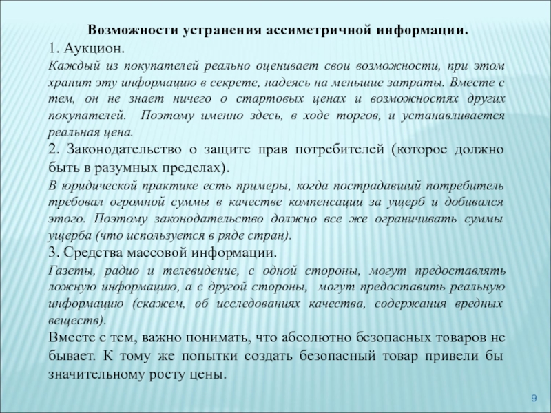 Слайд 9Возможности устранения ассиметричной информации.