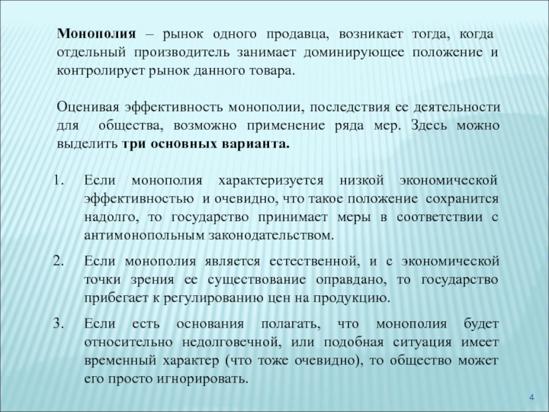 Если монополия характеризуется низкой экономической эффективностью и очевидно, что такое положение сохранится надолго, то государство принимает меры в соответствии с антимонопольным законодательством.