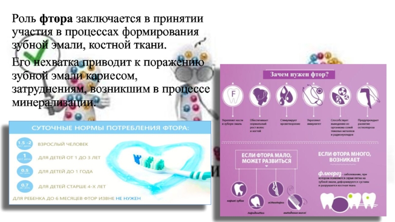 Слайд 18Роль фтора заключается в принятии участия в процессах формирования зубной