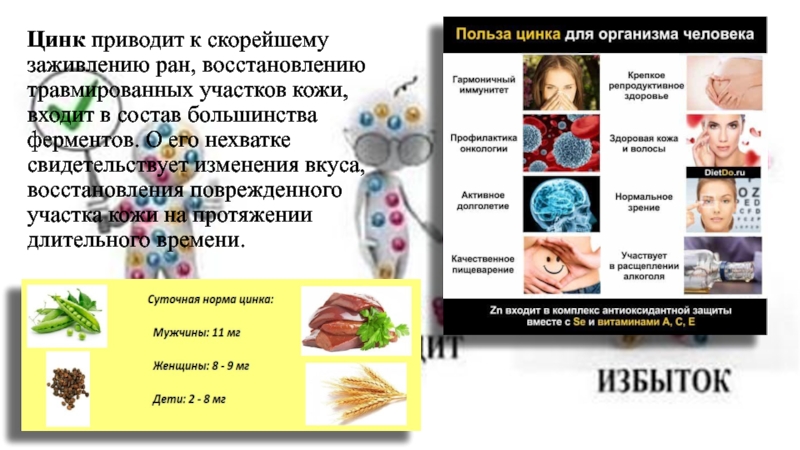 Слайд 16Цинк приводит к скорейшему заживлению ран, восстановлению травмированных участков кожи,