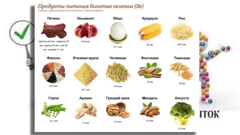 Слайд 20Селен обеспечивает стойкую иммунную систему, принимает участие в функционировании щитовидки.