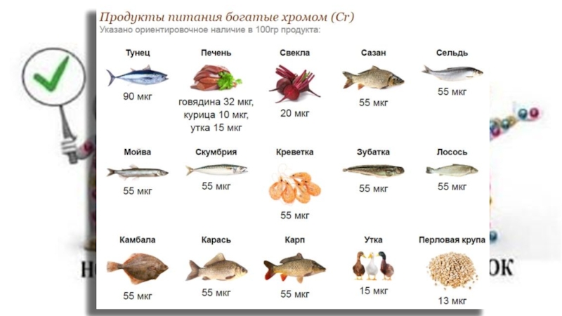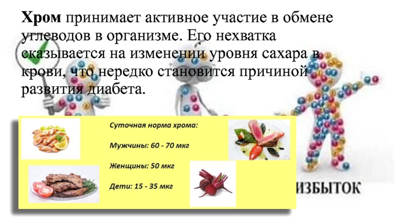 Слайд 24Хром принимает активное участие в обмене углеводов в организме. Его