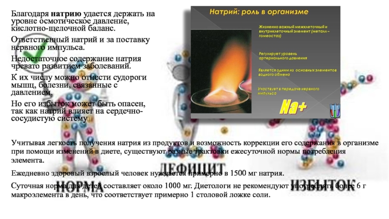 Слайд 4Благодаря натрию удается держать на уровне осмотическое давление, кислотно-щелочной баланс.