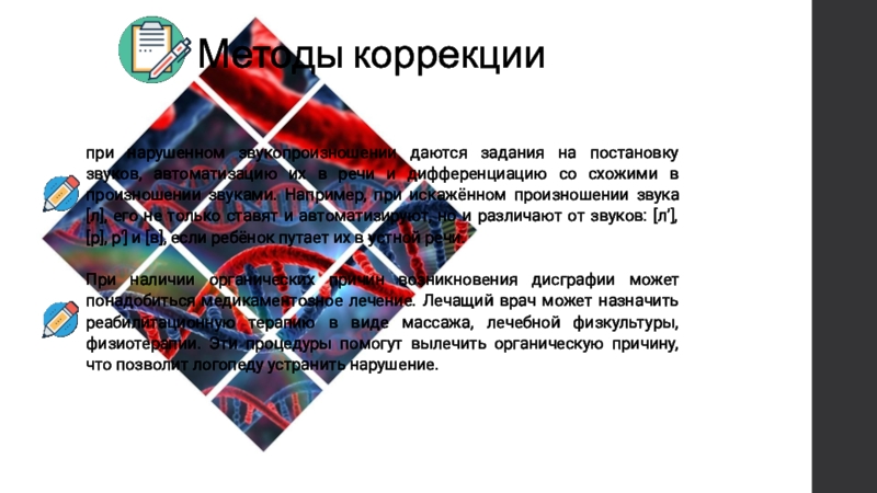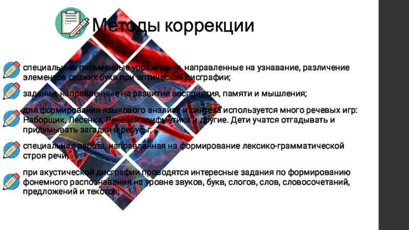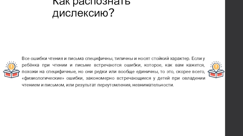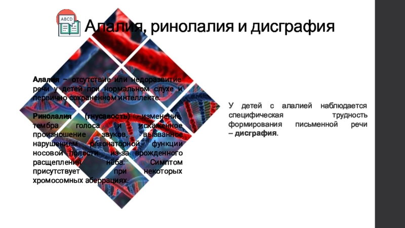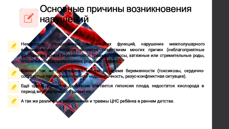 дислексии – нарушение способности к обучению читать и писать, при нормальном интеллекте, обусловлена мутациями в гене DYX1C1 (HSA1*q21), продукт которого отвечает за взаимодействие рецептора эстрогена с белками теплового шока Hsp70 и Hsp90. Это аутосомно-доминантный признак.