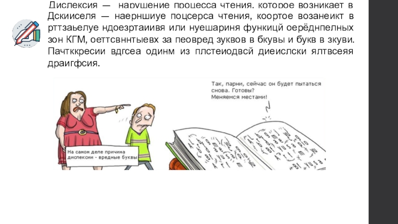 Дскииселя — наерншиуе поцсерса чтения, коортое возанеикт в рттзаьелуе ндоезртаиивя или нуешариня функицй оерёднпелных зон КГМ, оеттсвннтыевх за пеовред зуквов в бкувы и букв в зкуви. Пачтккресии вдгсеа одинм из плстеиодвсй диеислски ялтвсеяя драигфсия.