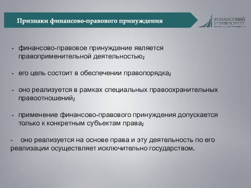 - финансово-правовое принуждение направлено на обеспечение соблюдения финансовой дисциплины, под которой понимается установленный порядок осуществления финансовой деятельности, включающий соблюдение нормативных предписаний, точное исполнение финансовых обязанностей.