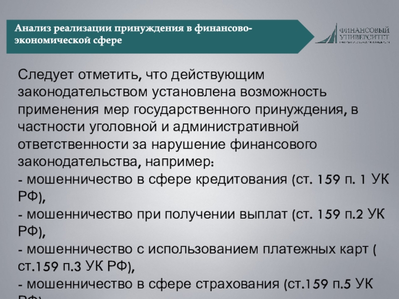 Следует отметить, что действующим законодательством установлена возможность применения мер государственного принуждения, в частности уголовной и административной ответственности за нарушение финансового законодательства, например