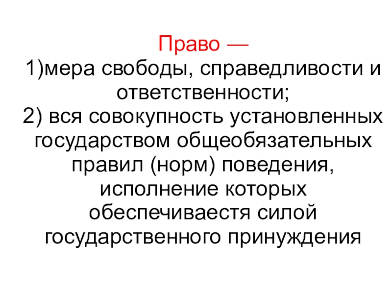 Право —  1)мера свободы, справедливости и ответственности;  2) вся совокупность установленных государством общеобязательных правил (норм)
