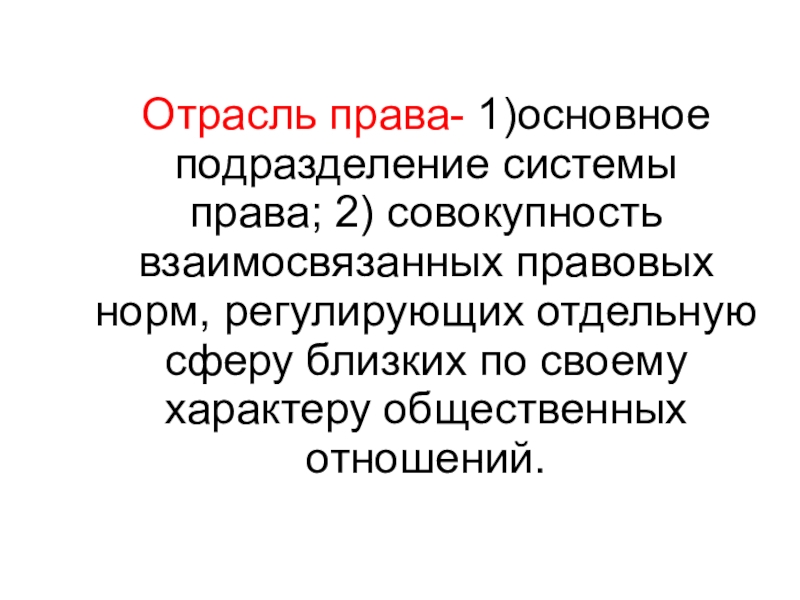 Отрасль права- 1)основное подразделение системы  права; 2) совокупность взаимосвязанных правовых норм, регулирующих отдельную  сферу близких