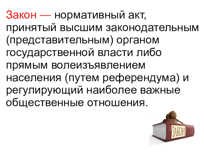 Слайд 11Закон — нормативный акт, принятый высшим законодательным (представительным) органом государственной