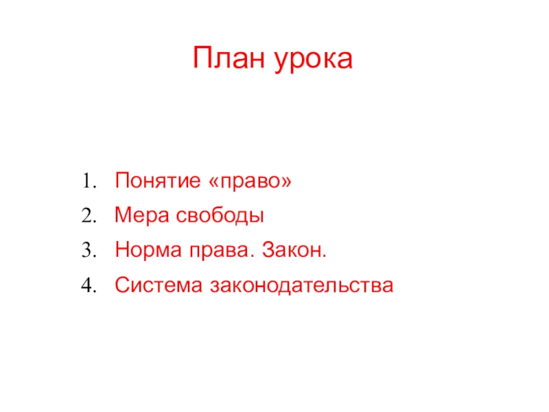 План урокаПонятие «право»Мера свободыНорма права. Закон.Система законодательства