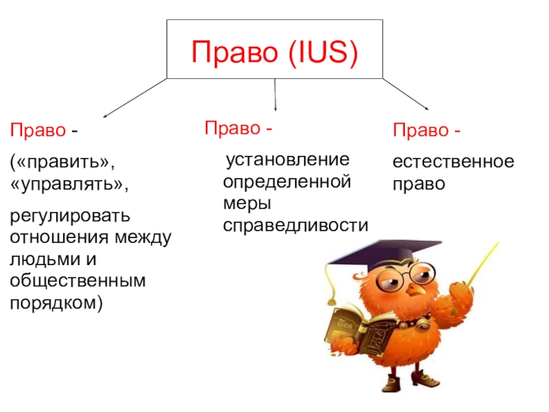 Право (IUS)Право -  установление определенной меры справедливостиПраво -(«править», «управлять»,регулировать отношения между людьми и общественным порядком) Право