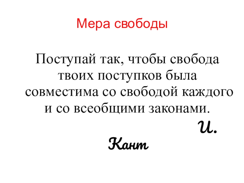 Мера свободыПоступай так, чтобы свобода твоих поступков была совместима со свободой каждого и со всеобщими законами.