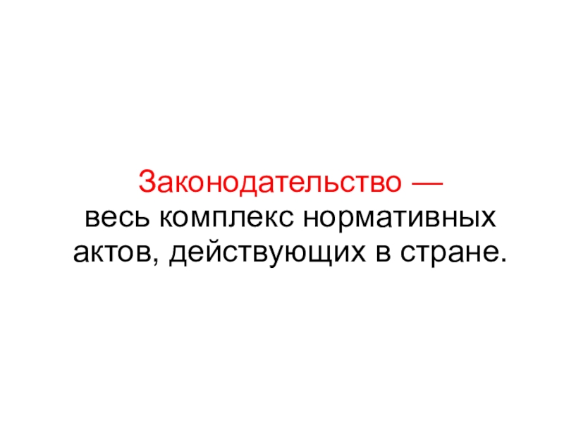 Слайд 15Законодательство — весь комплекс нормативных актов, действующих в стране.