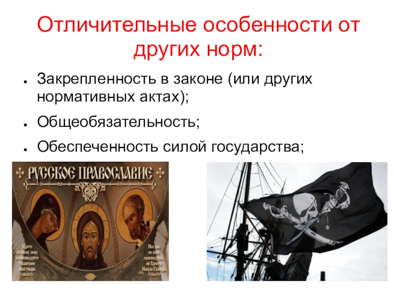 Отличительные особенности от других норм: Закрепленность в законе (или других нормативных актах);Общеобязательность;Обеспеченность силой государства;