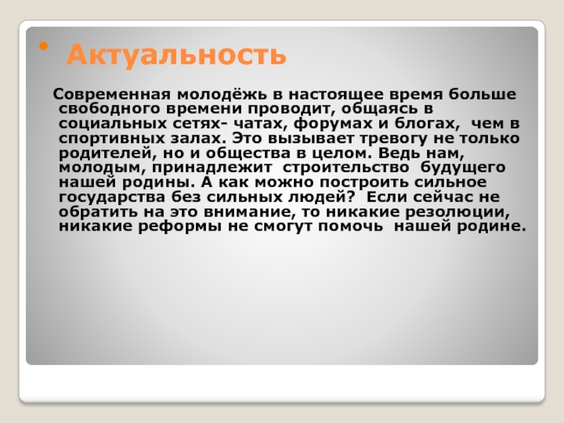 и блогах, чем в спортивных залах. Это вызывает тревогу не только родителей, но и общества в целом. Ведь нам, молодым, принадлежит строительство будущего нашей родины. А как можно построить сильное государства без сильных людей? Если сейчас не обратить на это внимание, то никакие резолюции, никакие реформы не смогут помочь нашей родине.