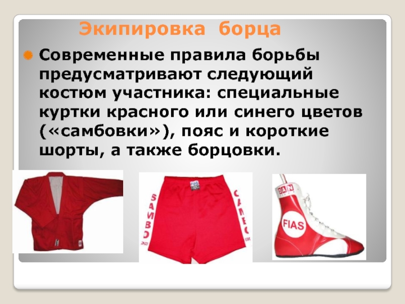 костюм участника: специальные куртки красного или синего цветов («самбовки»), пояс