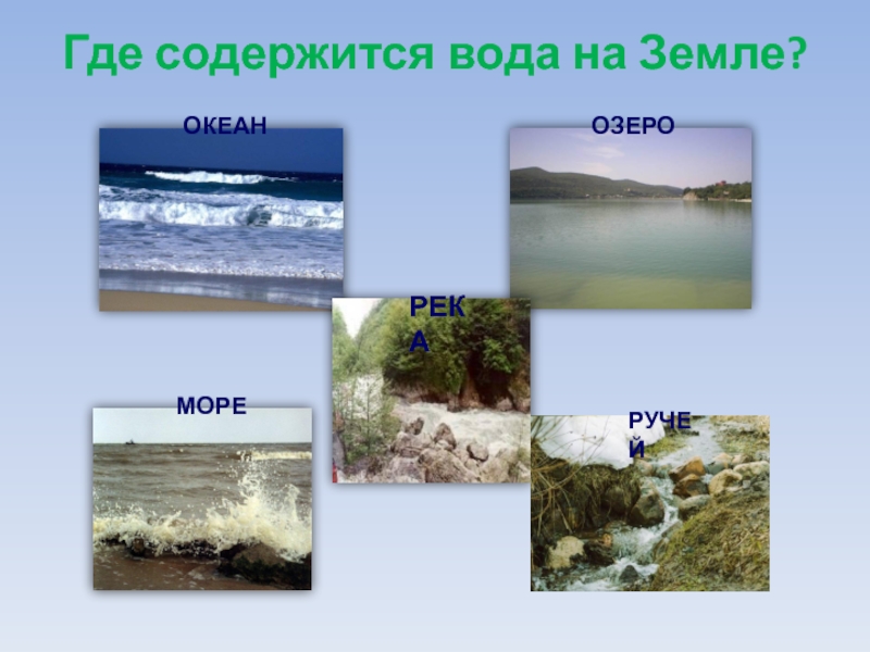 Где содержится вода на Земле? ОКЕАНОЗЕРОМОРЕРЕКАРУЧЕЙ