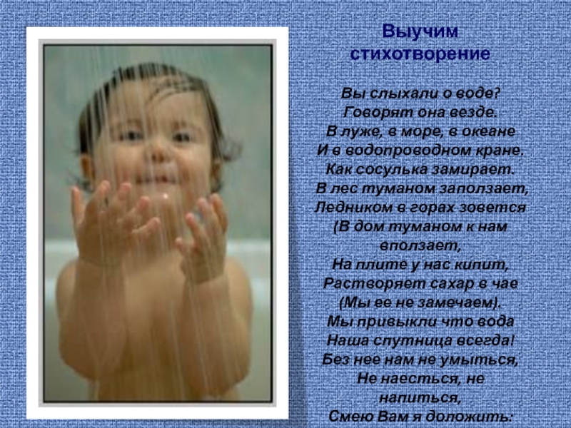 Выучим стихотворениеВы слыхали о воде? Говорят она везде. В луже, в море, в океане И в водопроводном