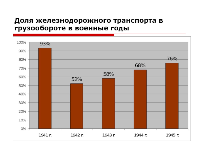 Слайд 10Доля железнодорожного транспорта в грузообороте в военные годы