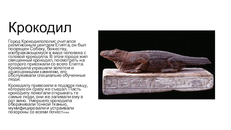 городе жил священный крокодил, посмотреть на которого приезжали со всего Египта. Крокодила украшали золотом и драгоценными камнями, его обслуживали специально обученные люди.