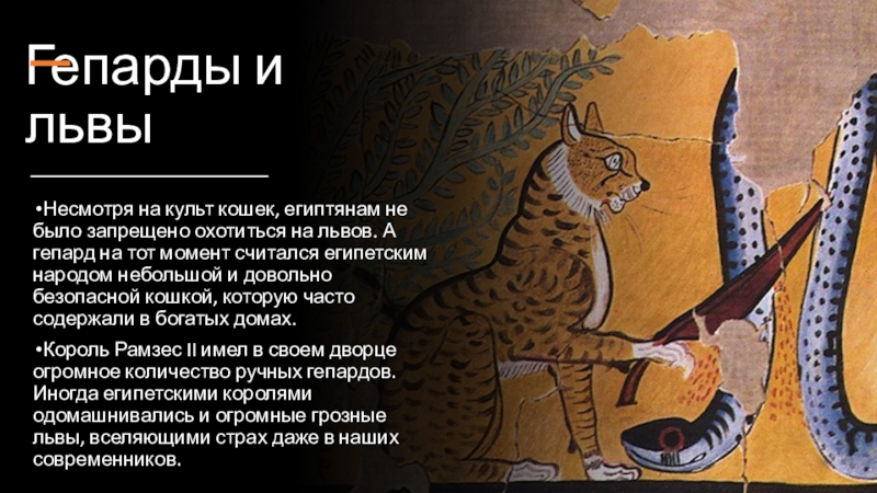 Король Рамзес II имел в своем дворце огромное количество ручных гепардов. Иногда египетскими королями одомашнивались и огромные грозные львы, вселяющими страх даже в наших современников.