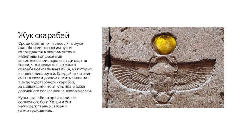 что в каждый шар самка скарабея откладывает яйца, из которых и появлялись жучки. Каждый египтянин считал своим долгом носить талисман в виде чудотворного скарабея, защищающего их от зла, яда и даже дарующего воскрешение после смерти.