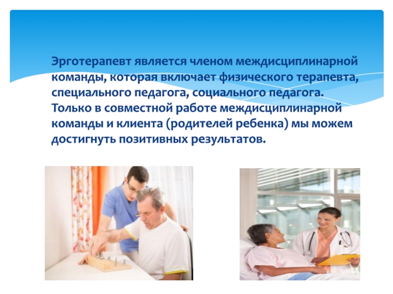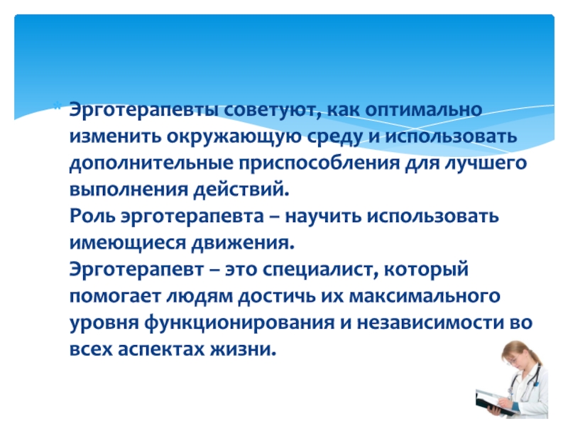 Задача эрготерапевта - адаптация пациента в его повседневной деятельности, достижение максимальной независимости
