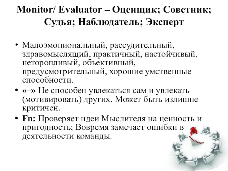 Слайд 6Monitor/ Evaluator – Оценщик; Советник; Судья; Наблюдатель; Эксперт