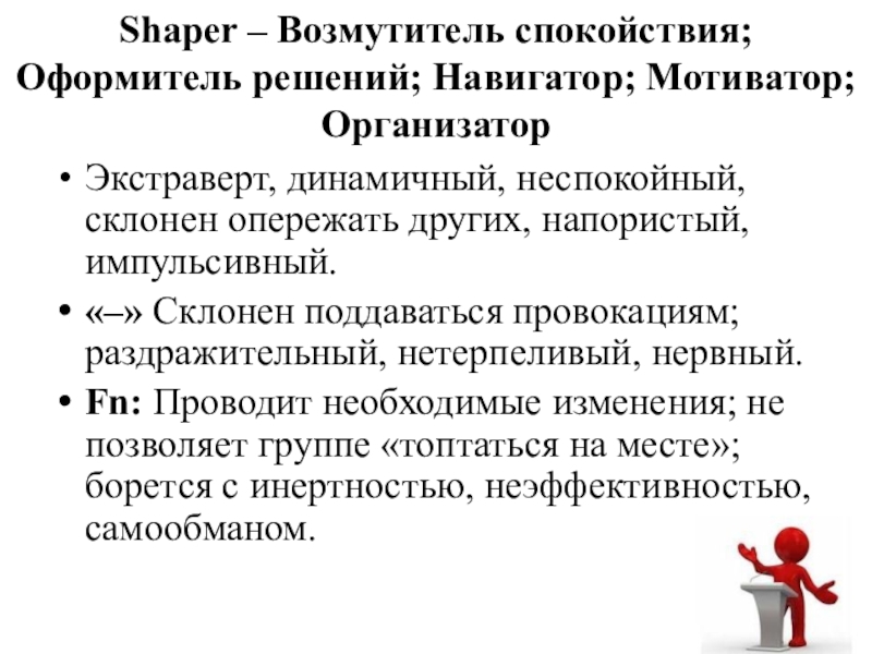 Слайд 4Shaper – Возмутитель спокойствия; Оформитель решений; Навигатор; Мотиватор; Организатор
