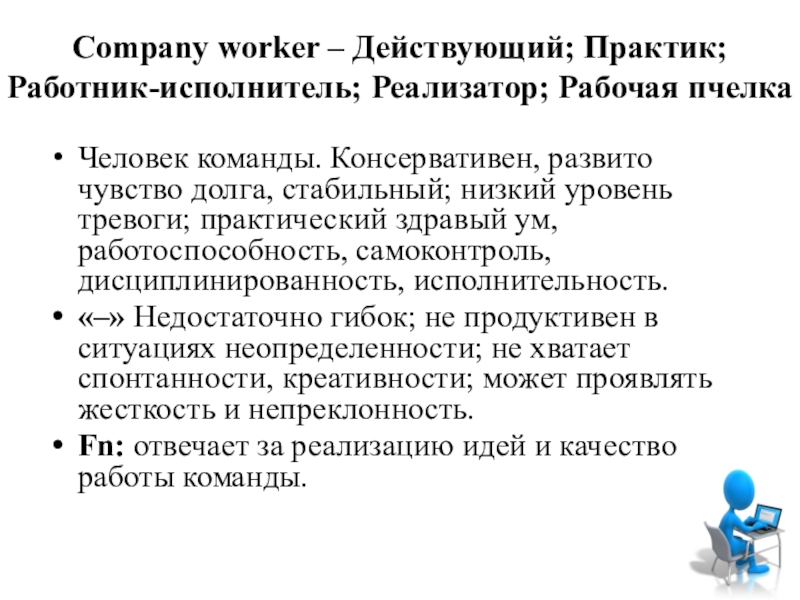 Слайд 7Company worker – Действующий; Практик; Работник-исполнитель; Реализатор; Рабочая пчелка