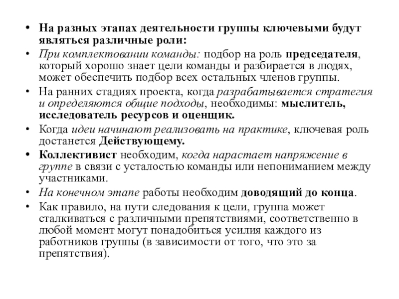 Слайд 13На разных этапах деятельности группы ключевыми будут являться различные роли: