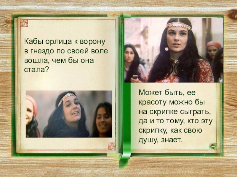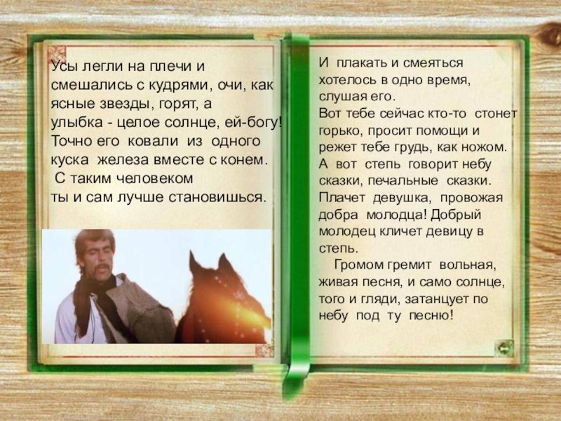 Вот тебе сейчас кто-то стонет горько, просит помощи и режет тебе грудь, как ножом. А вот степь говорит небу сказки, печальные сказки. Плачет девушка, провожая добра молодца! Добрый молодец кличет девицу в степь.
