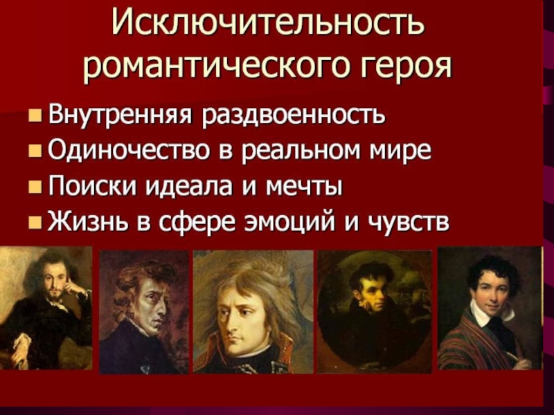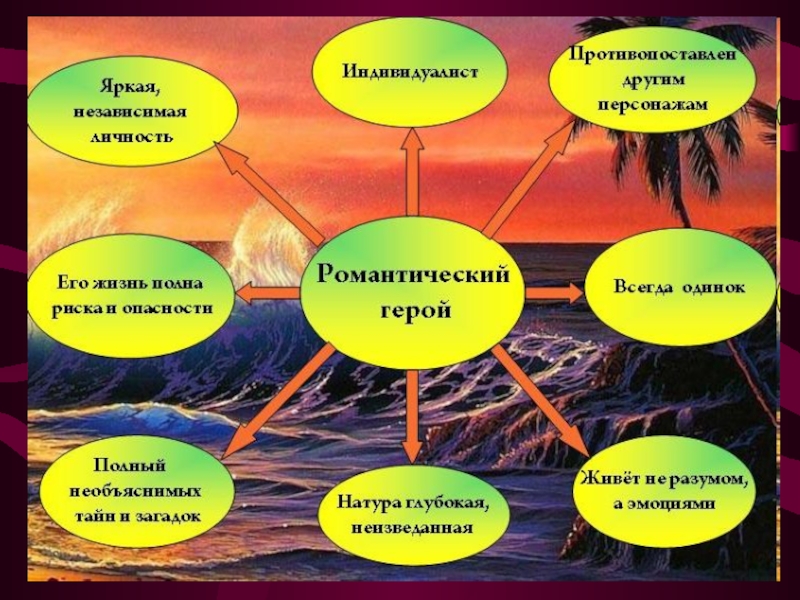 III. Романтический герой: исключительная личность в исключительных обстоятельствах;индивидуалист, противостоит толпе; в конфликте с миромсвободная личностькипучие страсти;одинок;полярные состояния