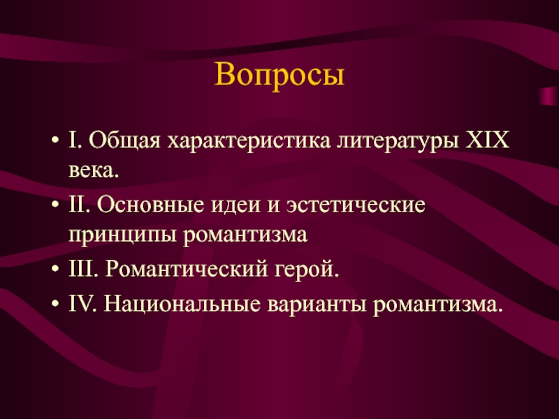 ВопросыI. Общая характеристика литературы XIX века.II. Основные идеи и эстетические принципы романтизмаIII. Романтический герой.IV. Национальные варианты романтизма.