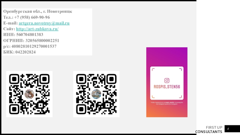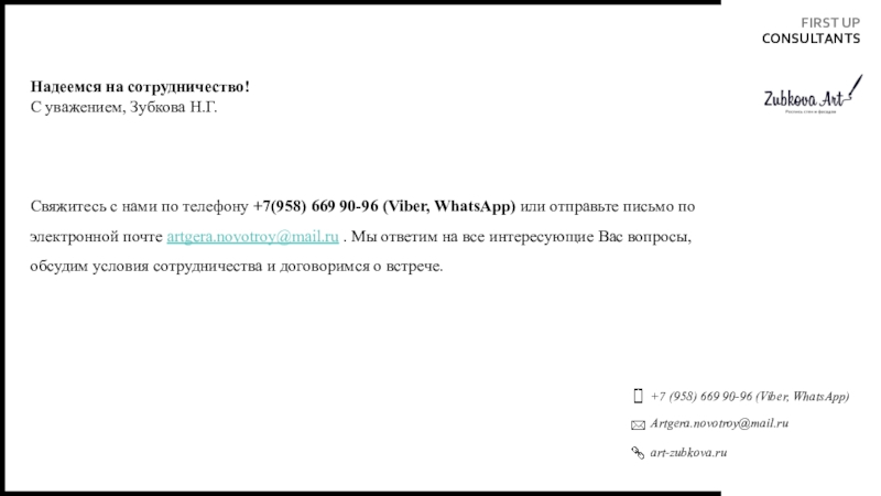 +7 (958) 669 90-96 (Viber, WhatsApp)Artgera.novotroy@mail.ruart-zubkova.ruFIRST UP  CONSULTANTSНадеемся на сотрудничество!С уважением, Зубкова Н.Г.Свяжитесь с нами по