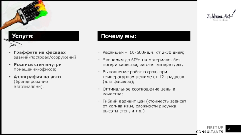 Услуги:Граффити на фасадах зданий/построек/сооружений;Роспись стен внутри помещений/офисов;Аэрография на авто (брендирование автоэмалями).Почему мы:Распишем - 10-500кв.м. от 2-30 дней;Экономим