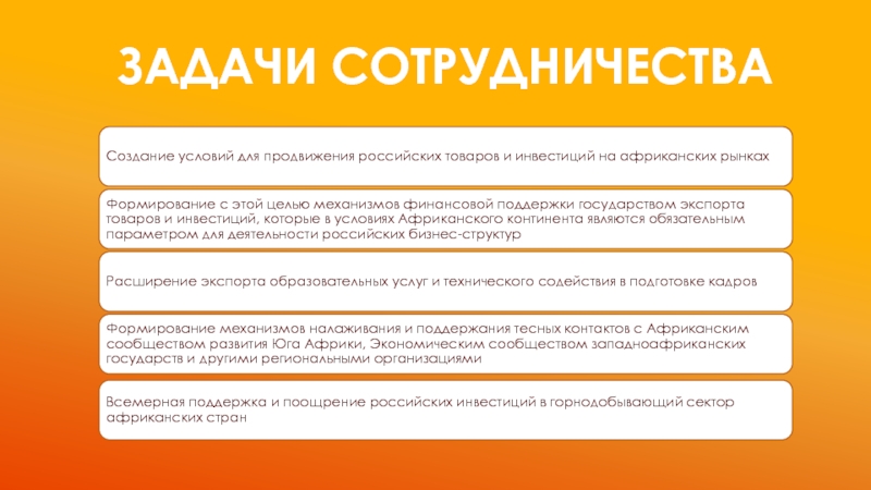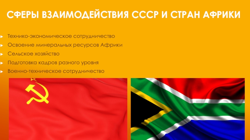 Сферы взаимодействия СССР и стран АфрикиТехнико-экономическое сотрудничествоОсвоение минеральных ресурсов АфрикиСельское хозяйствоПодготовка кадров разного уровняВоенно-техническое сотрудничество