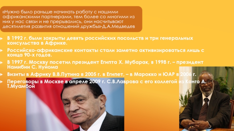 В 1997 г. Москву посетил президент Египта Х. Мубарак, в 1998 г. – президент Намибии С. Нуйома