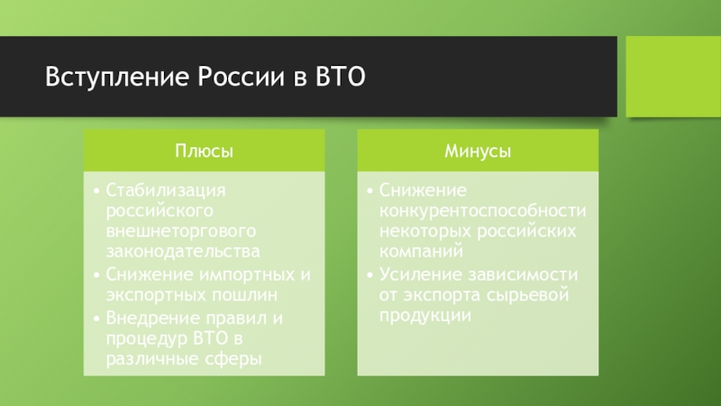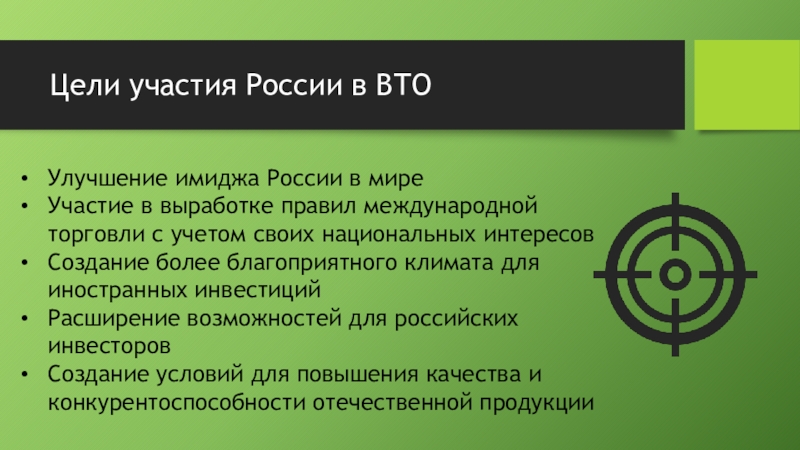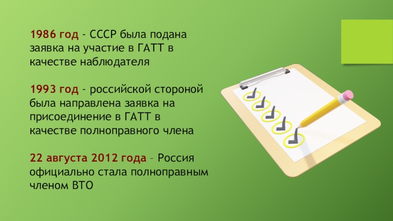 заявка на присоединение в ГАТТ в качестве полноправного члена22 августа 2012 года – Россия официально стала полноправным членом ВТО