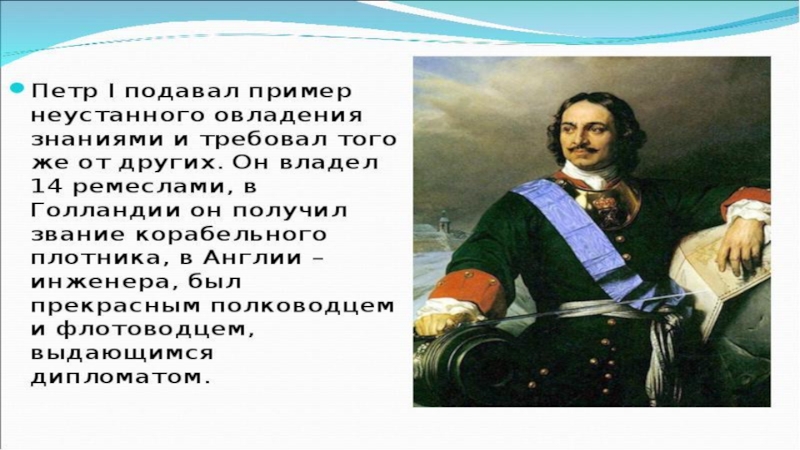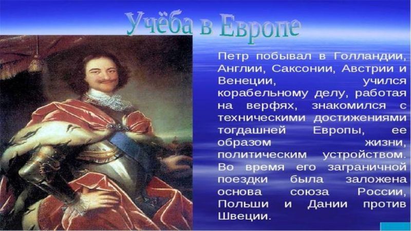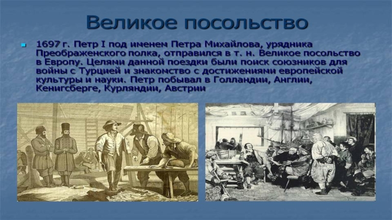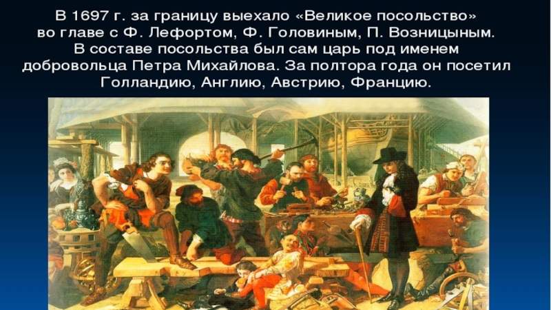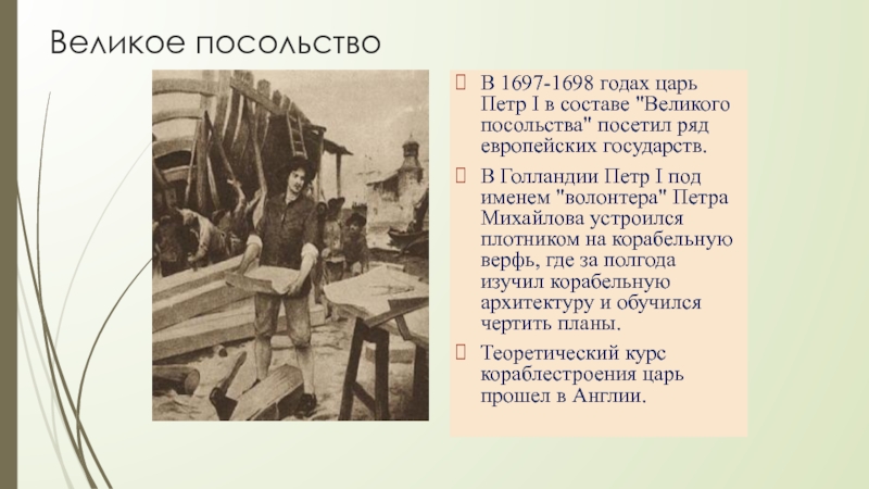именем "волонтера" Петра Михайлова устроился плотником на корабельную верфь, где за полгода изучил корабельную архитектуру и обучился чертить планы.Теоретический курс кораблестроения царь прошел в Англии.